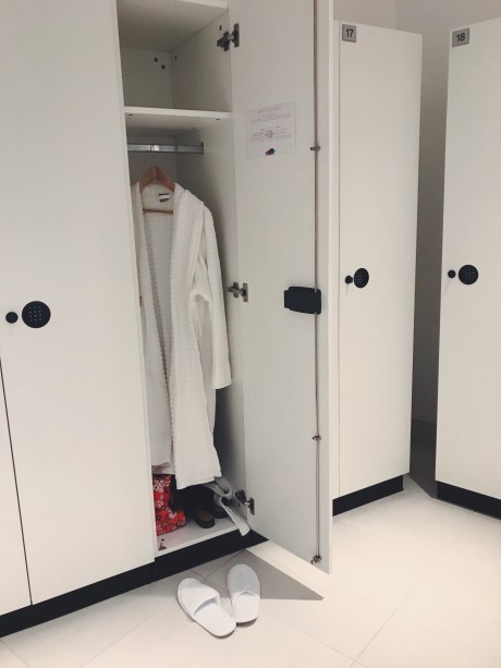 The receptionist himself led us into the co-ed changing room. It was a co-ed space because it wasn’t your typical locker that you use at a spa – it was an actual changing room, like a dressing room you change in at a retail store. So it didn’t matter if men and women were in the same room. The bathrooms were separate though. I have to mention the hair dryer option was quite unfortunate – One hairdryer option was in the locker room amongst the door-lined room: noisy and loud with no privacy amongst the sexes. The other option was in the segregated bathrooms, but this option seemed as though it was from 1980. Yikes. Wet hair for the day it was for me.